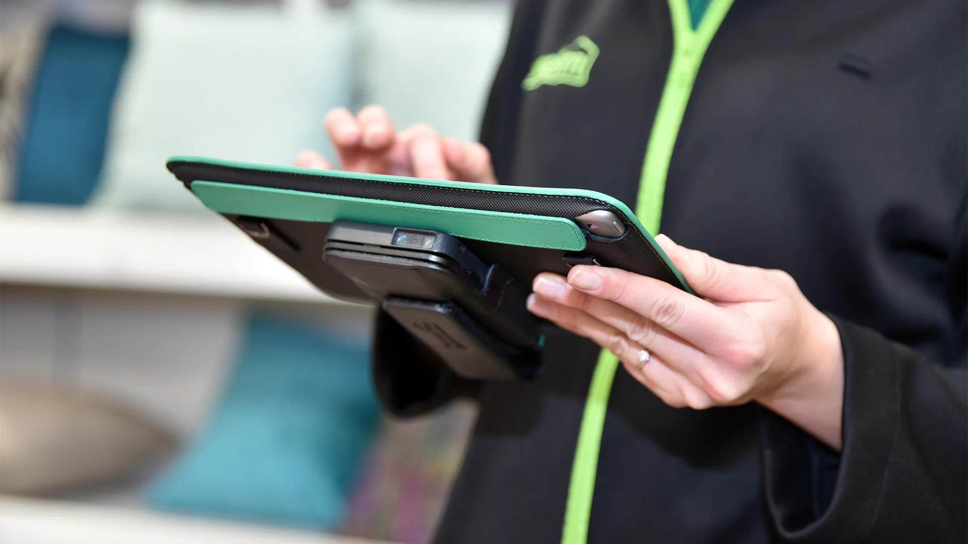 Dunelm faced a familiar challenge when deploying a range of hardware in their store environment. How could they package together a range of disparate pieces of hardware in a package that their staff found comfortable to use, that protected the products and fitted with their core brand. Vibrant provided a customised V:Tab solution, bringing together the ipad air and a Verifone e355 mPOS unit together is a premium case design.